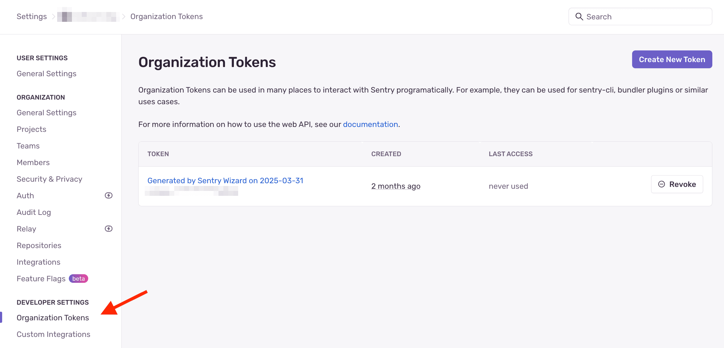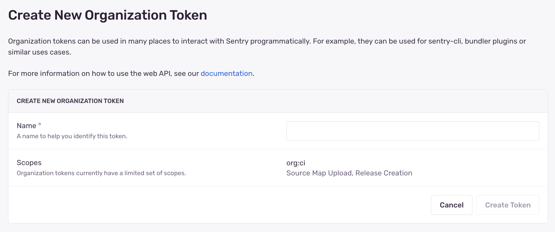 • Organization Tokens: These tokens are bound to an organization, and have access to all projects within that organization. They have a limited set of permissions and are designed to be used in CI environments and with Sentry CLI.