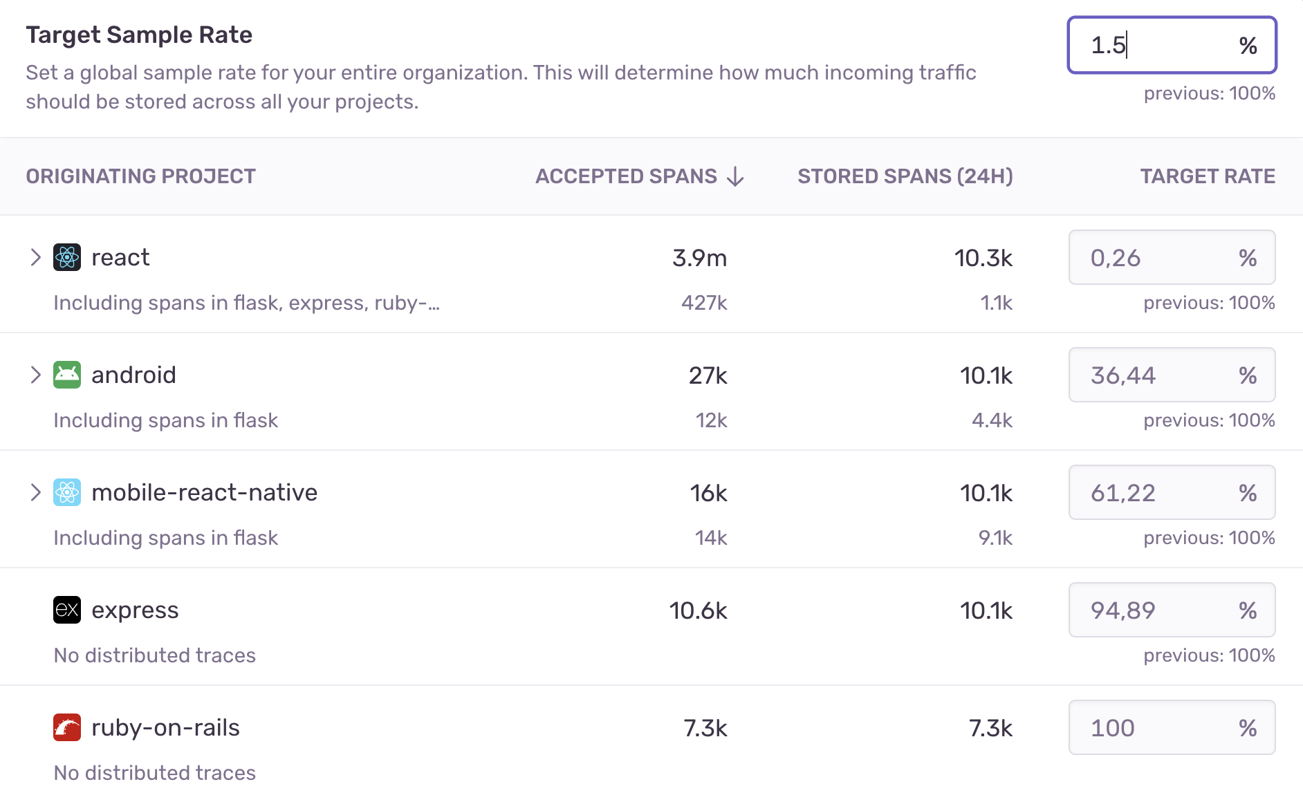 Here you can configure a fixed sample rate for each project in your organization. This value will specify the percentage of incoming traffic that should be stored for each respective project. The sample rate can be between 0% and 100%, defaulting to 100% if not adjusted.