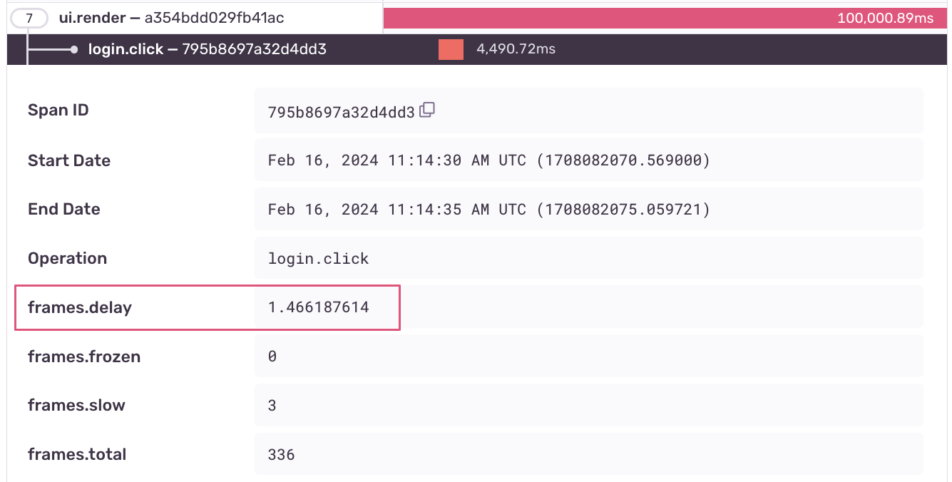 Frames Delay is the user-perceived delayed duration of rendered frames. The Android SDK automatically attaches this information to every span, giving useful insights and showcasing which spans correlate the most to an impaired user experience. For more technical details about frame delay, head over to our develop docs.