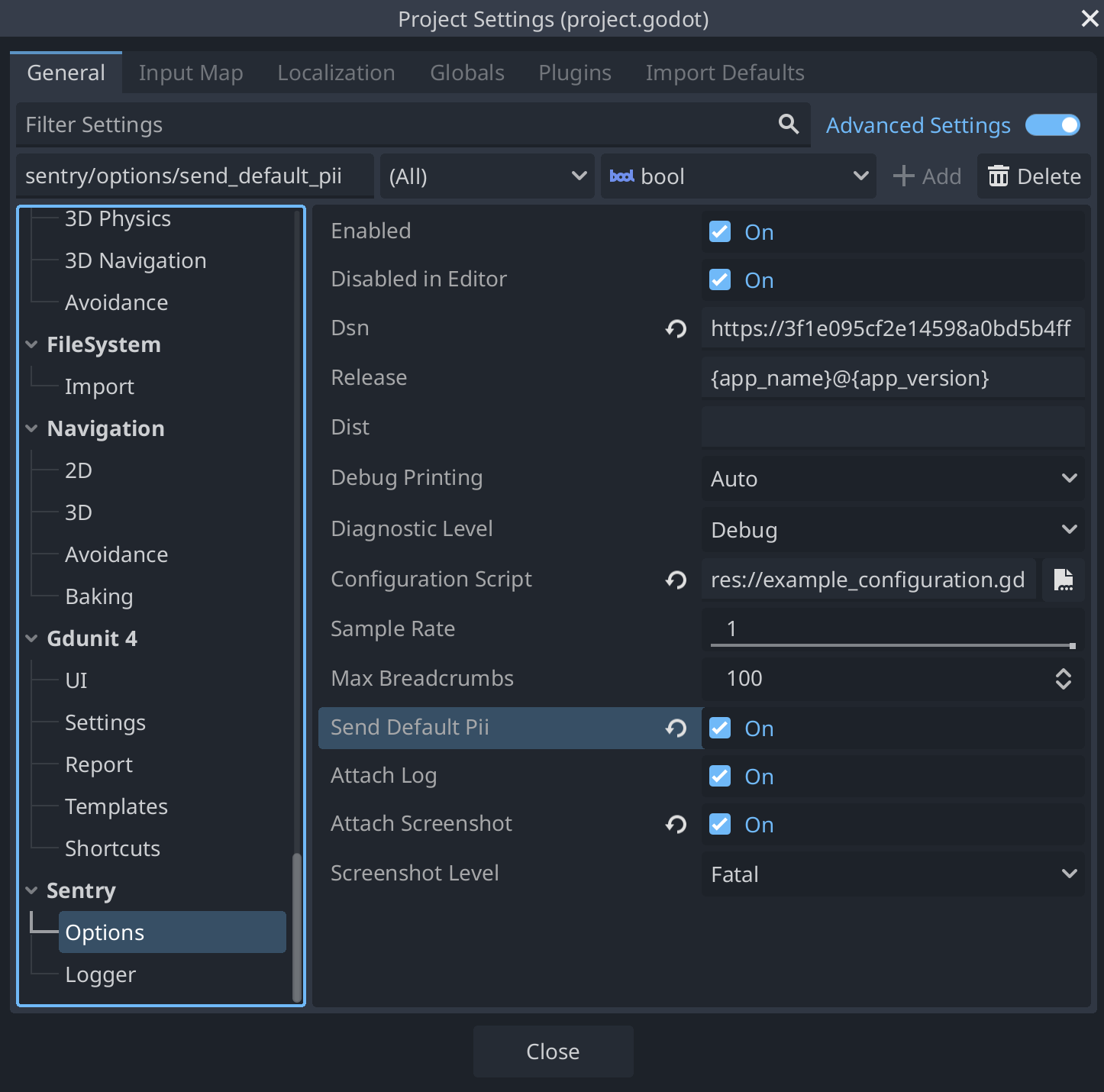 Sentry can be configured via Project Settings or in GDScript. To access project settings in Godot Engine, navigate to Project > Project Settings..., then scroll down the sections list on the left until you find the Sentry section.