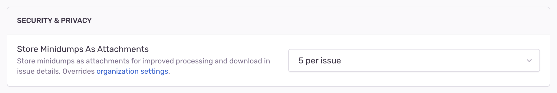 You can enable Store Minidumps As Attachments in your organization or project settings under Security & Privacy. By default, this setting is disabled. Determine the maximum number of crash reports that will be stored per issue; disabled, unlimited, or maximum per issue: