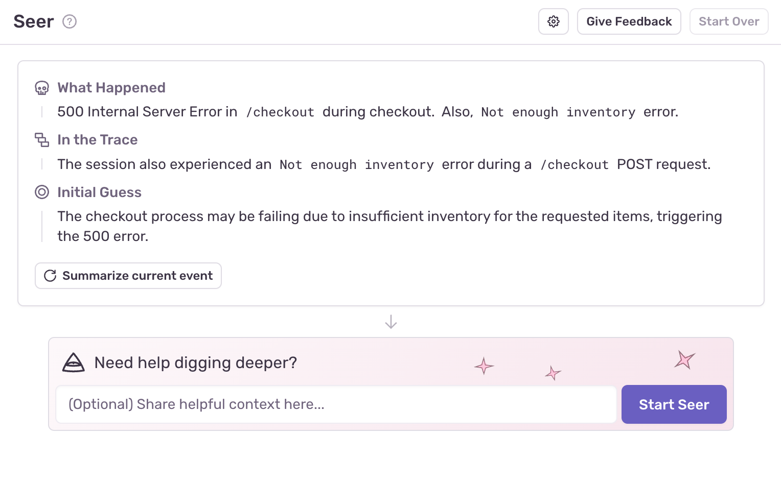 - The more Sentry context you have, the better equipped Seer will be to help: consider instrumenting your application to collect traces, profiles and logs, and send them to Sentry.
