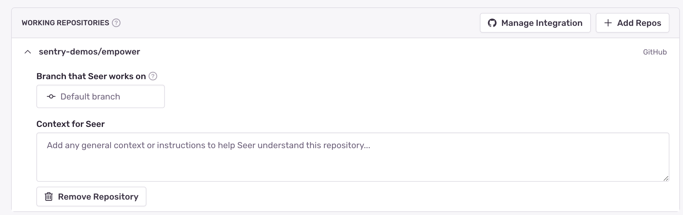This context is crucial to Seer's capabilities, and it allows it to do things like investigate a backend service that may be the true root cause for a frontend bug you are trying to troubleshoot.