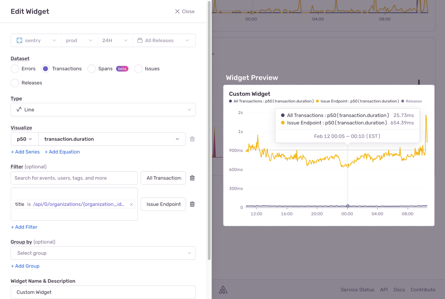 If you are building a widget with transaction data, and would like to use event-like filters (eg. transaction.duration:>100ms) or custom tags that you set on your transactions, we will routinely collect metrics to show you accurate counts and rates.