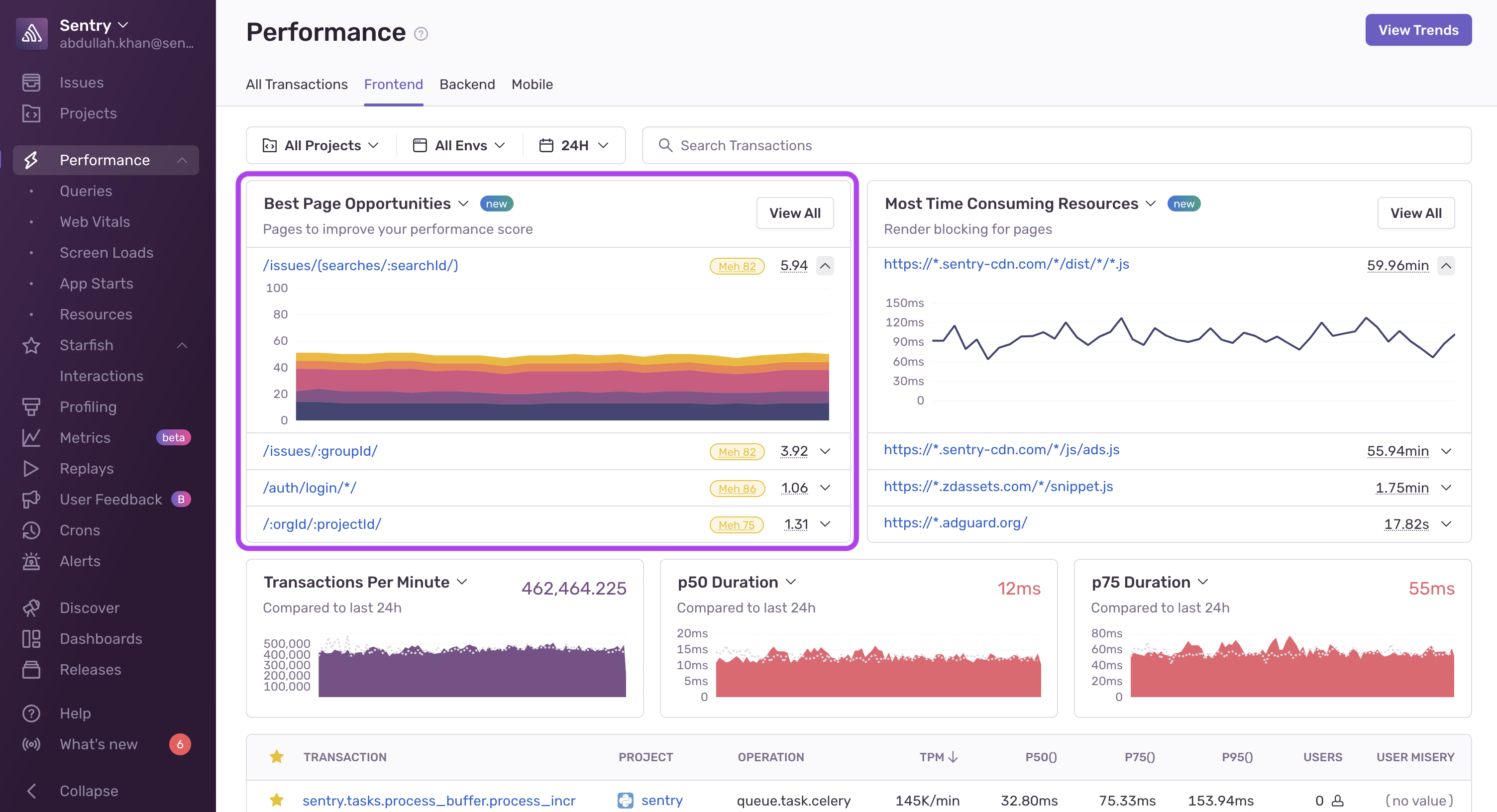 Shows web pages in your application that have the most Opportunity to improve. These pages usually have poor Web Vital scores, high throughput, or both. Click on a page to open its Page Overview page or click "View All" to open the Web Vitals page.