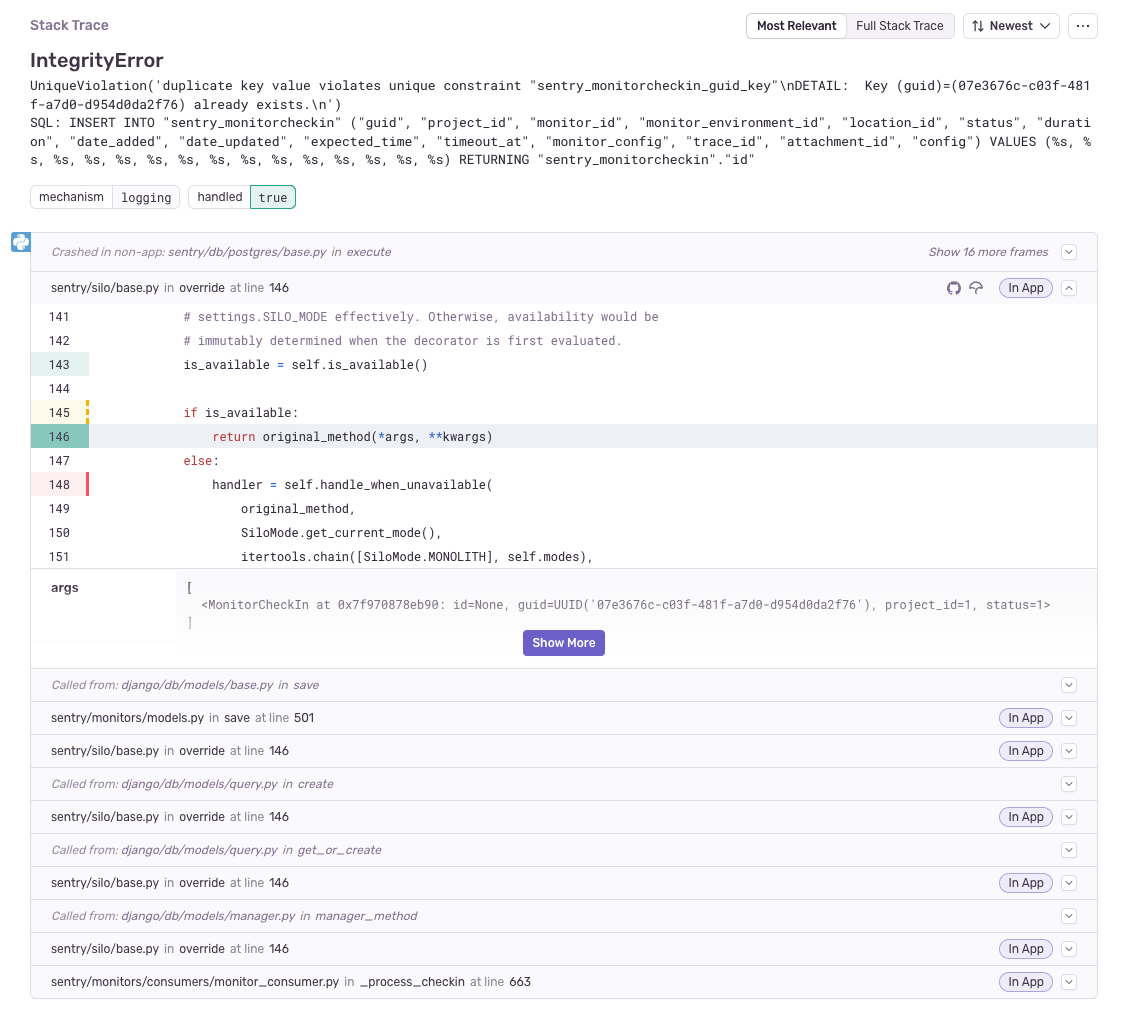 Sometimes the trace will be supplemented by a Trace-related Issue. A Trace-related Issue is a different issue that occurred during the same trace as the event in view. This is useful for understanding the context of the current issue and may help you identify its root cause. A Trace-related Issue allows the developer to quickly navigate between the two related events.